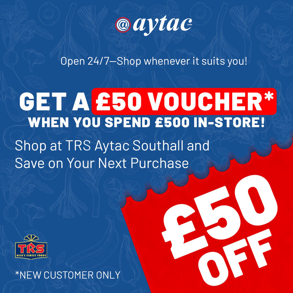 Unlock incredible savings with our latest in-store offer! Spend £500 or more at TRS Aytac Southall and receive a £50 shopping voucher for your next purchase. Stock up on fresh produce, frozen goods, catering supplies, and more while earning extra value!